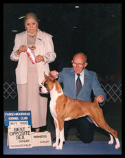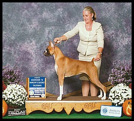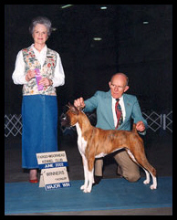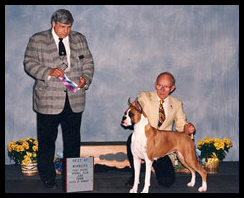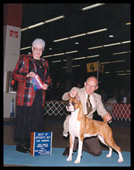 CH Omega’s Solid Gold After finishing his AKC championship, Gerry moved to New Delhi, India, where he now lives with his new owner, Shyam Mehta of Next Step Boxers. Gerry was the #2 (all breed) dog in India in 2002. He is now retired from the show ring and siring beautiful puppies. |